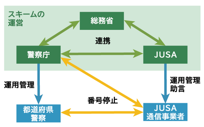 JUSAは、総務省・警察庁とともに番号停止スキームを運用するほか、本スキームに参加する通信事業者(JUSA事業者)へ助言や関係機関との調整等を行い、関係者間の連携が円滑に行われるようサポートします。
