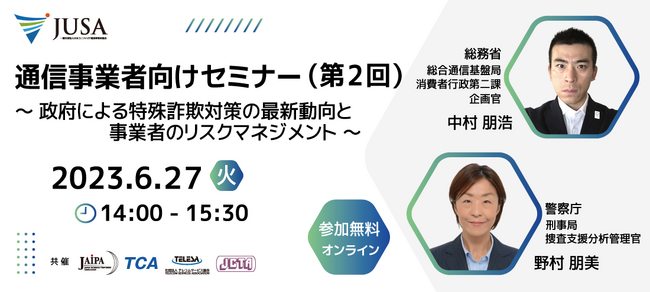 特殊詐欺の撲滅には、業界全体でサービスの悪用リスクに対抗していく必要があります。これらの取り組みは事業者の事業継続性を担保する上でも必要不可?です。昨今の状況及び政府の新しい取り組み、通信事業者のリスクや対策等を理解していただくために、JUSAは一般社団法人日本インターネットプロバイダー協会(JAIPA)、一般社団法人電気通信事業者協会(TCA)、一般社団法人テレコムサービス協会(テレサ協)、一般社団法人日本ケーブルテレビ連盟(JCTA)の共催によるセミナーを開催します。皆様の参加をお待ちしております。