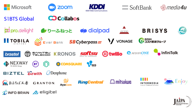 会 員: 日本マイクロソフト株式会社・ZVC Japan株式会社(zoom)・株式会社KDDIウェブコミュニケーションズ・ソフトバンク株式会社・株式会社まほろば工房・株式会社りーふねっと・株式会社Eligitel・株式会社プロディライト・株式会社三通テレコムサービス・インフォブレイン株式会社・インターメディア・テクノロジーズ・ジャパン合同会社・有限会社アユコム・株式会社アセンド・株式会社メディア4u・デンフォン株式会社・株式会社クロノス・ブライシス株式会社・株式会社Enjoy・ブラステル株式会社・株式会社ウミガメ・株式会社グラントン・株式会社リンク・株式会社ソフツー・ミツイワ株式会社・Twilio Japan合同会社・Dialpad Japan株式会社・株式会社アジャストワン・ジェイエムエス・ユナイテッド株式会社・リングセントラルジャパン株式会社・株式会社ネクスウェイ・ビーウィズ株式会社・S and BTS Global株式会社・BTジャパン株式会社・Cloopen株式会社・トビラシステムズ株式会社・株式会社エバーバンク・株式会社コムスクエア・エスビーサイバーパス株式会社・株式会社コラボス・株式会社NEOコーポレーション・Vonage Japan 合同会社・株式会社コスト削減グループ(2023年6月10日)