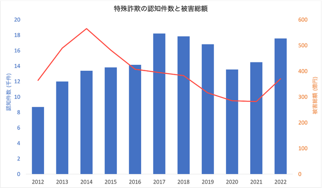 「オレオレ詐欺」をはじめとする特殊詐欺は、2014年には被害総額が過去最高の約566億円となりました。その後、警察による取り締まりの強化や、官・民が連携した予防活動、犯行使用電話の利用制限といった対策の実施等により一旦は減少に向かったものの最近は再び増加基調にあり、2022年の特殊詐欺の認知件数は約1万8,000件、被害総額は約370億円となるなど依然として厳しい状態が続いています。