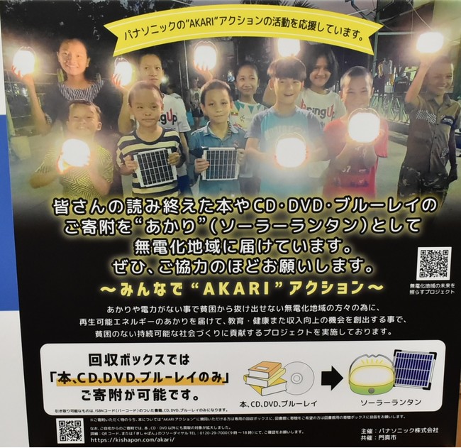 門真市では、市民が誇りと愛着を持ち、持続可能なまちの発展をめざし、市民が主体となるまちづくりを推進するため、市民公益活動の支援や生涯学習の促進等、多様な主体と連携のうえ、地域振興施策など様々な取り組みに努めています。この度、門真市民文化会館ルミエールホールで実施している「かどま大学」に講師としてお招きしているパナソニック株式会社が取り組む、リサイクル品(本・CD・DVD)等の資源をあかり(ソーラーランタン)に換え、世界の無電化地域の方々に届けるという企業市民活動に対し、門真市も連携・協力することで市民公益活動をより推進し、貧困のない持続可能な社会づくりに寄与することを目的とし、門真市役所や門真市民プラザなどに寄附ボックスを設置しています。