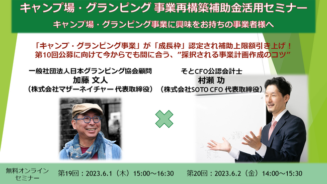 本セミナーでは、日本グランピング協会の顧問であり、今回の「成長枠」認定の立役者である"グランピング第一人者"の加藤文人から、“最新のキャンプ場・グランピングの業界動向”、及び「成長枠」認定の裏側をお伝えするとともに、