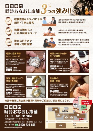 買取専門店「いちふじ」を運営する株式会社インターワーク(東京都千代田区 代表取締役 山尾 利之)令和4年9月30日、兵庫県西宮市のLalaport内にあるイトーヨーカドー甲子園店1階に、修理専門店「修理専門 時計おなおし本舗」を初出店いたします。