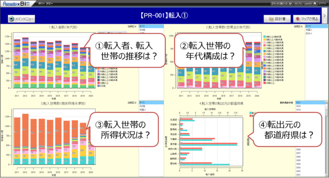 「Acrocity×BI」は地方自治体の住民データを匿名化し、グラフやマップを自動生成するEBPM支援ツールです。基幹情報システムと接続することにより住民情報、福祉情報、水道情報、内部情報など多岐に渡るデータを自動集計し、部局横断で集計結果を見える化することにより、データリテラシーが低い職員でもデータの利活用が可能となります。また、相関関係と因果関係の両面から分析する機能を有していることにより、データサイエンティストがいなくても統計学的に大事なところだけを「日本語で」解析することができます。