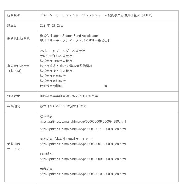 JSFP(ジャパン・サーチファンド・プラットフォーム投資事業有限責任組合)は、2021年12月に株式会社Japan Search Fund Acceleratorと野村リサーチ・アンド・アドバイザリー株式会社により設立された投資事業有限責任組合です。サーチファンドの仕組みを活かし、高齢化等により事業承継に課題を抱える国内の中小企業について、サーチャーが経営者となる第三者承継の実現を目指します。