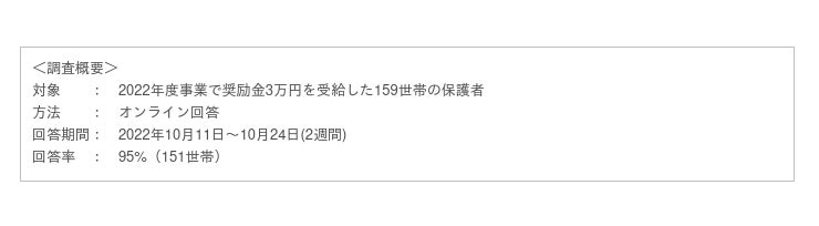 この「6ヶ月レポート」は、応援後の子どもたちの状況やサッカーの継続性、活動に対するニーズや改善点を確認するため、2022年度の奨励金受益者159世帯を対象に実施しました。