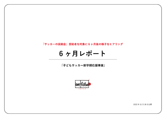 経済的な貧困や社会格差によるスポーツの機会格差の解消に取組むNPO法人「love.futbol Japan」は、今年春の新学期にサッカーの奨励金3万円を給付した159世帯を対象に、受給後の6ヶ月の様子についてのアンケート調査を実施しました。調査の結果、93%の子どもがサッカーを継続できていることが確認できました。このレポートでは、サッカーの継続性や、子どもたちの今後の抱負、活動に対する保護者の方々の感想をまとめています。