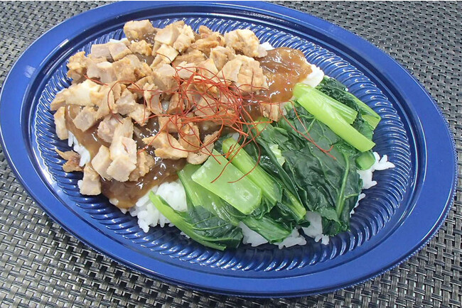 五香粉(ウーシャンフェン)をきかせてスパイス香るルーロー餡に仕上げました。隠し味に入れた少量のお酢が全体の味をさっぱりとひき締めています。とろみのある餡で、ご飯と焼豚を口に入れたときの一体感が味わえるようこだわりました。