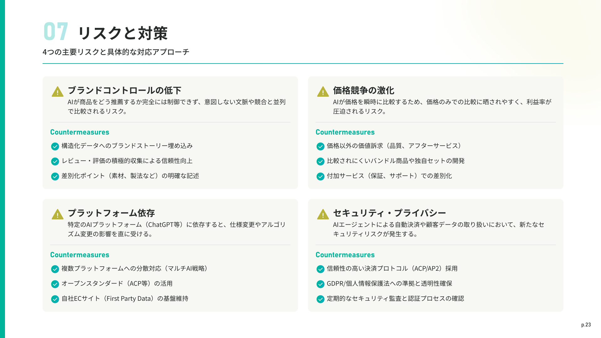 ブランドコントロールの低下、プラットフォーム依存、価格競争の激化、セキュリティの4つの主要リスクと、具体的な対応策を解説します。