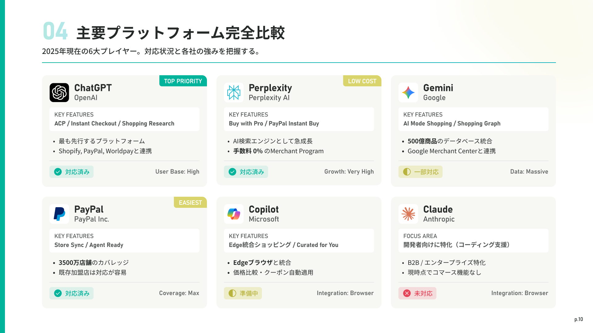 ChatGPT、Perplexity、Gemini、Copilot、PayPalの5大プラットフォームを徹底比較。各社の特徴、対応状況、戦略的な投資判断の指針を提供します。