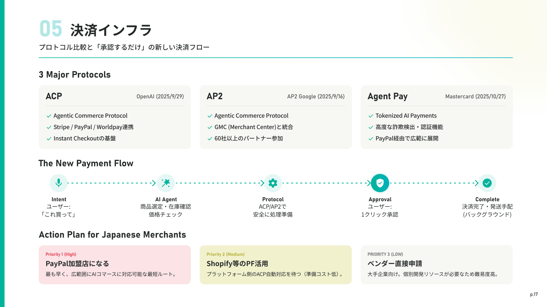 ACP(OpenAI)、AP2(Google)、Agent Pay(Mastercard)の3大プロトコルを解説。新しい決済フローと、日本のEC事業者向けアクションプランを示します。