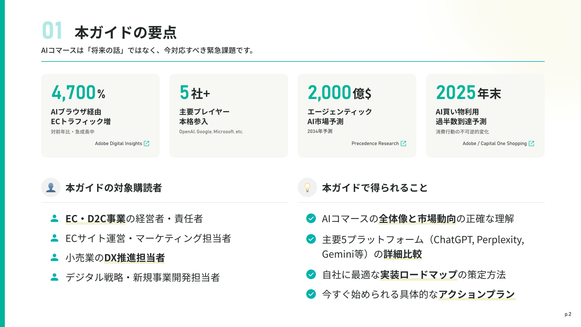 本ガイドは、AIコマースの市場動向から具体的な実装方法まで、EC事業者が今すぐ知るべき情報を全29ページに凝縮した資料です。単なるトレンド紹介ではなく、「各AIプラットフォームは今どこまで進んでいるのか」「EC・小売事業者は何を理解し、何を判断すべきか」という観点で構成しています。本ガイドの特徴