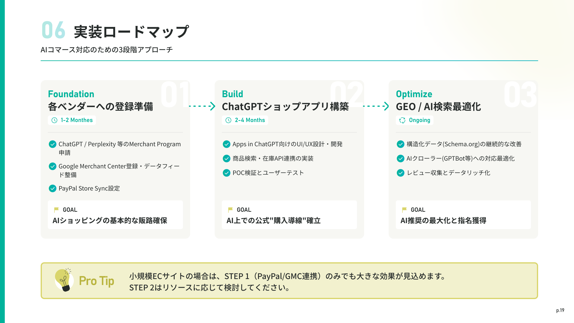 - - ACP/AP2プロトコルへの対応、構造化データ(Schema.org)の整備、各プラットフォームへの登録申請をサポートします。