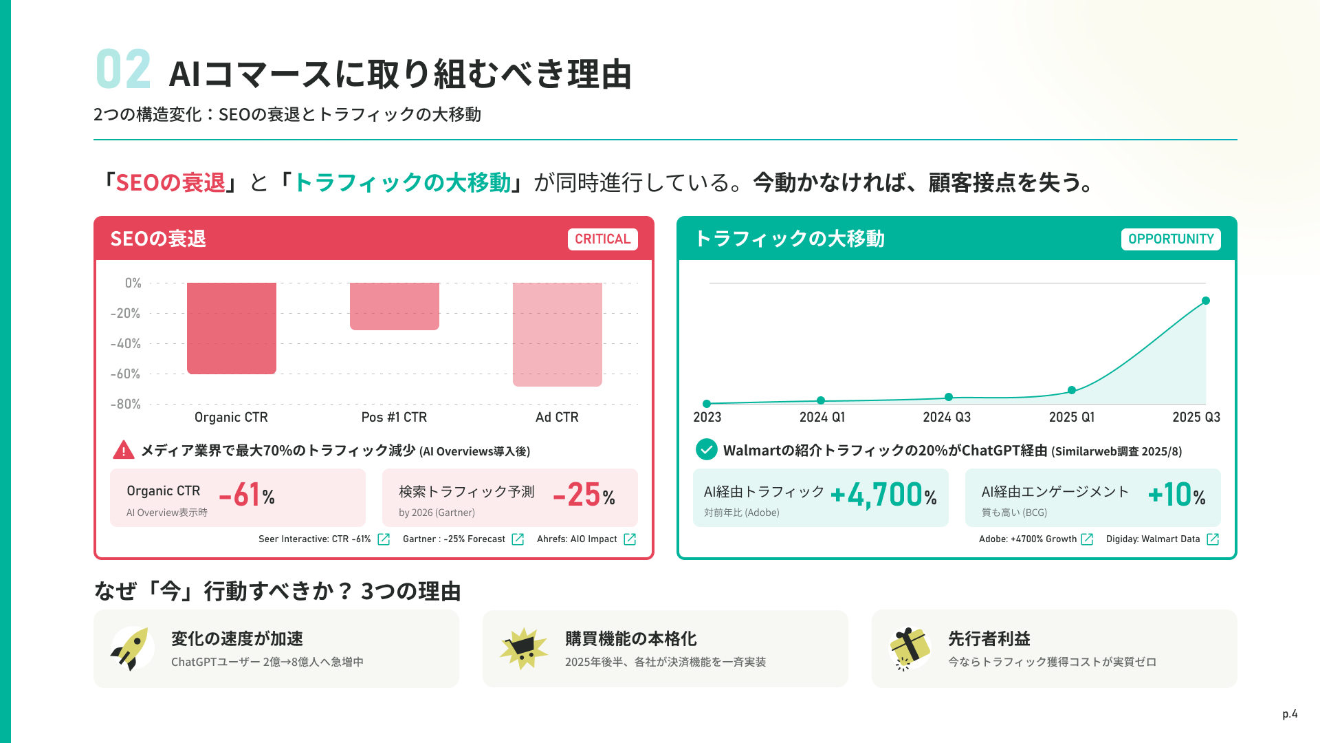 「SEOの衰退」と「トラフィックの大移動」という2つの構造変化を詳しく分析。行動しないリスクと、今行動するメリットを明確にします。