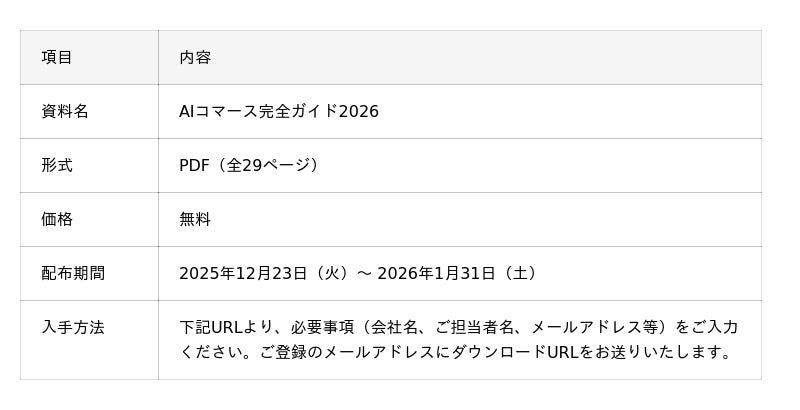AI(人工知能)を活用したサービスを展開するStellagent株式会社(本社:神奈川県横浜市、代表取締役:鈴木 章広、以下「当社」)は、AIコマース導入支援サービス「Omise AI(オミセ エーアイ)」の正式リリースを記念し、EC・D2C事業者向けの無料ホワイトペーパー『AIコマース完全ガイド2026』の提供を2025年12月24日より開始いたしました。本ガイドは2026年1月31日(土)まで無料でダウンロードいただけます。