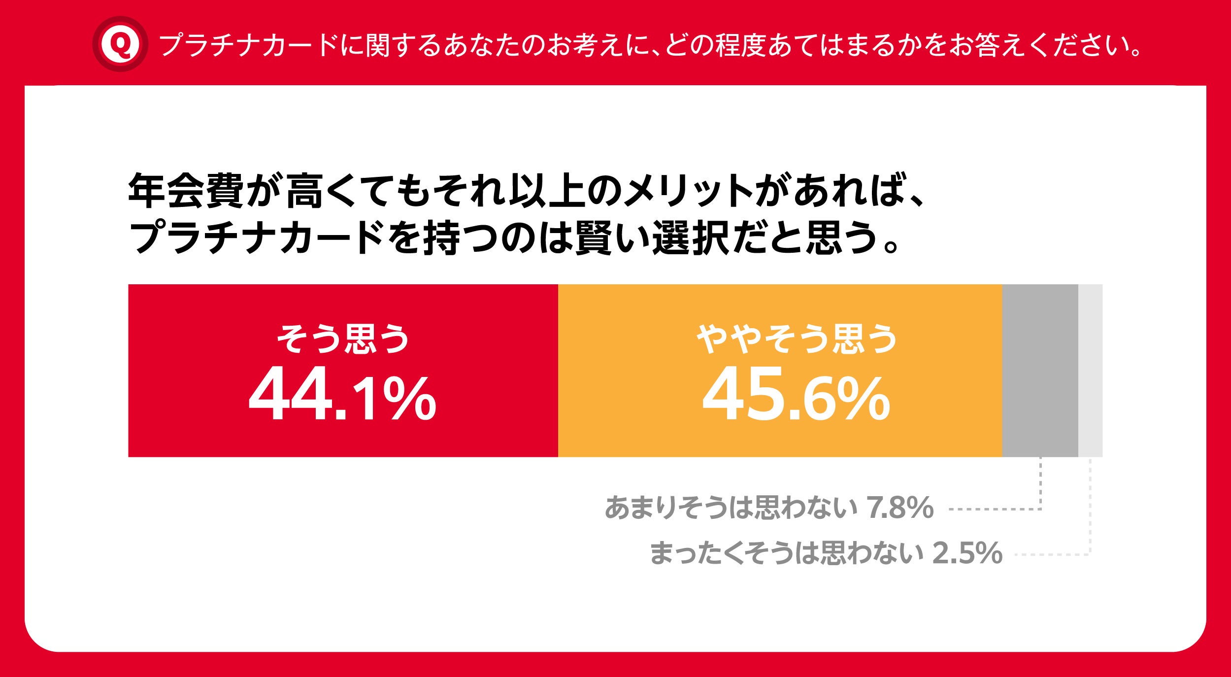 プラチナカード保有者を対象にプラチナカードに対する考えを聞いたところ、 「プラチナカードはステータスよりも、ポイントなどの実利が重要だと思う」と回答した人は86.3%という結果に。さらに、「年会費が高くても、見合う特典があればプラチナカードを持つのは賢い選択だと思う」と答えた人も89.7%にのぼり、プラチナカードはステータス性以上に、「実利」を得るための手段として受け入れられている実態が明らかになりました。