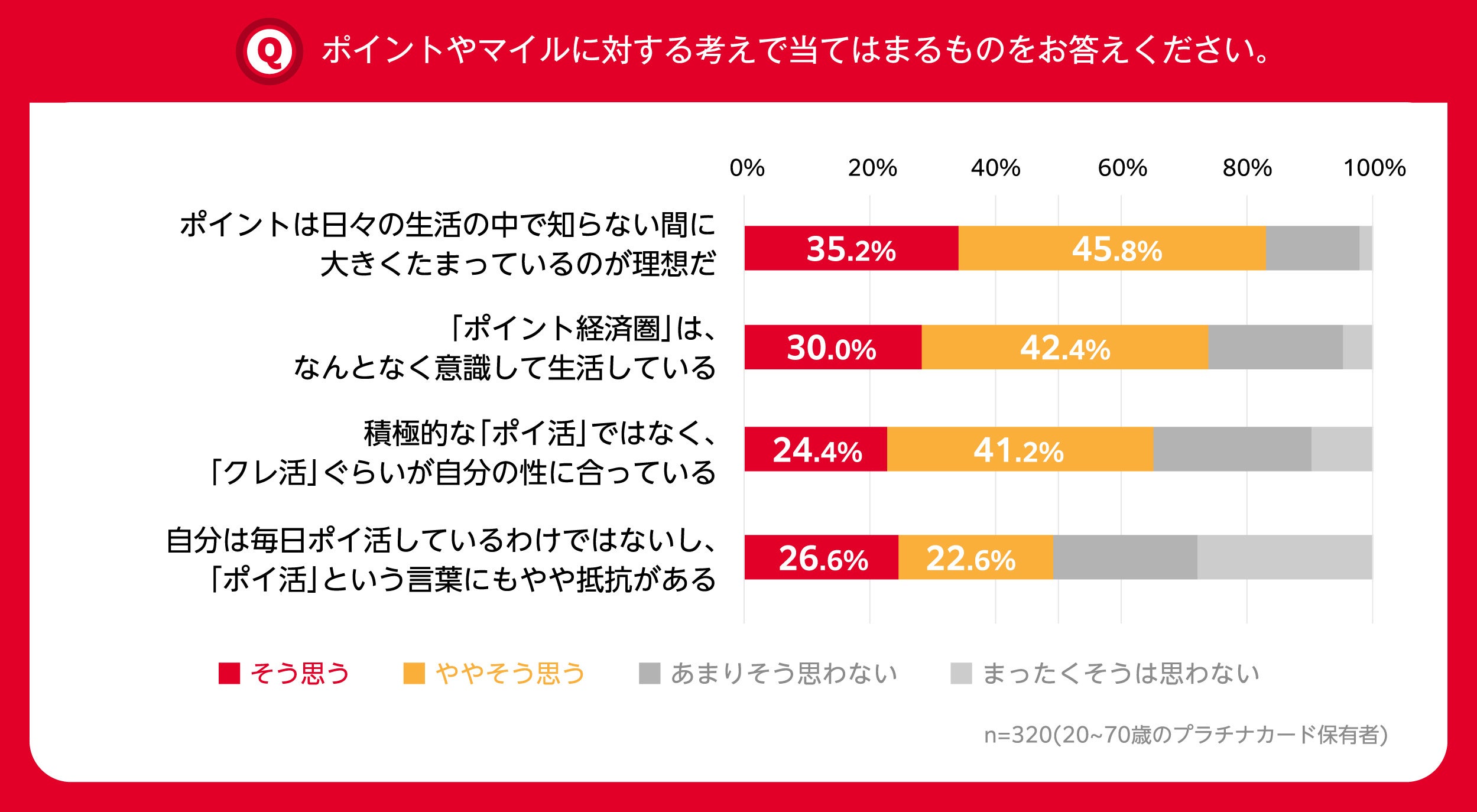 プラチナカード保有者のポイントやマイルに関する考えを聞いたところ、「ポイントは日々の中で知らない間に大きくたまっているのが理想」と考える人が81%という結果に。さらに、「積極的な「ポイ活」ではなく「クレ活」ぐらいが自分の性に合っている」と答えた人も 65.6%に達しており、多くのユーザーが日々最もポイント還元率の高い手段を考えて選択するなど積極的な「ポイ活」ではなく、クレジットカードに支払いを寄せることで無理なく自然にポイントをためる「クレ活」のスタイルを望んでいることが分かりました。