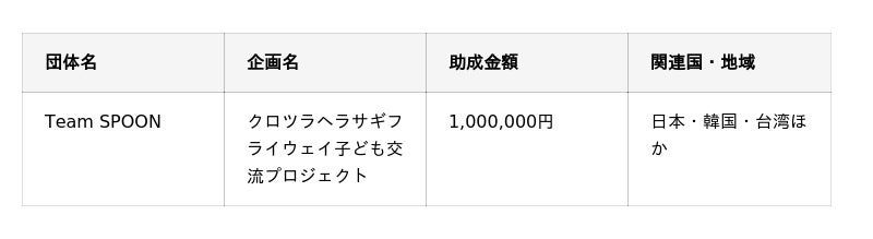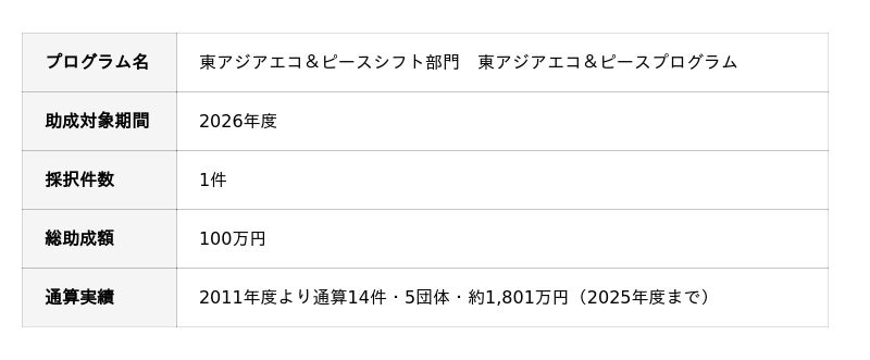2026年度の採択企画は、2021年度・2025年度に続き本プログラムで採択された団体による継続・発展企画です。東アジア各地で営巣・越冬する渡り鳥クロツラヘラサギや、その生息地である湿地を守る人々を、子どもたちの交流を通じてつなぎます。[表2: https://prtimes.jp/data/corp/153768/table/12_2_999fb6fc8189c084979ca5a9cfb1f665.jpg?v=202604230945 ]