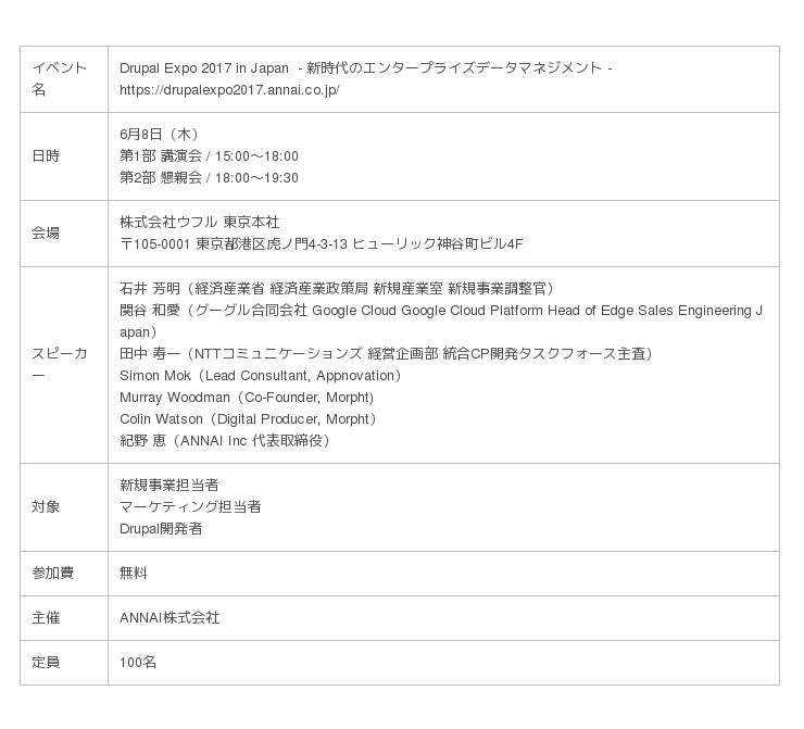 Drupalによる開発及びコンサルティングを専門とするANNAI株式会社(本社:京都府下京区、代表取締役:紀野 惠、以下ANNAI)は、6月8日 東京・神谷町にて、Drupalの国内事例紹介イベント「Drupal Expo 2017 in Japan - 新時代のエンタープライズデータマネジメント - 」を開催します。