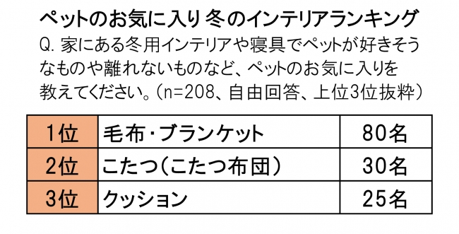 ペットのお気に入りの冬用インテリアは「毛布・ブランケット」が1位となりました。毛布がペットのお気に入りの理由として「暖かさと肌ざわりだと感じます。」(50代男性)、「ふかふかで柔らかく、暖かいから。」(30代女性)など、ペットも暖かく肌ざわりのよいものを気に入るようです。