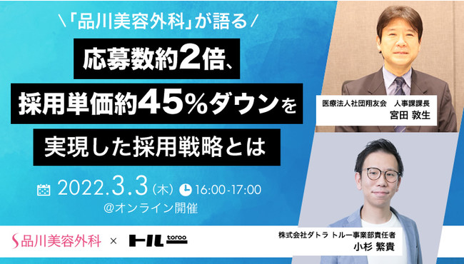 採用支援サービス「トルー」を運営する株式会社ダトラ(本社:大阪市中央区、代表取締役:草深悠介)は2022年3月3日(木)、品川美容外科の運営法人である医療法人社団翔友会の人事ご担当者様にご登壇いただき、「応募数約2倍」「採用単価約45%ダウン」を実現した採用戦略についてお話いただく無料オンラインセミナーを開催いたします。