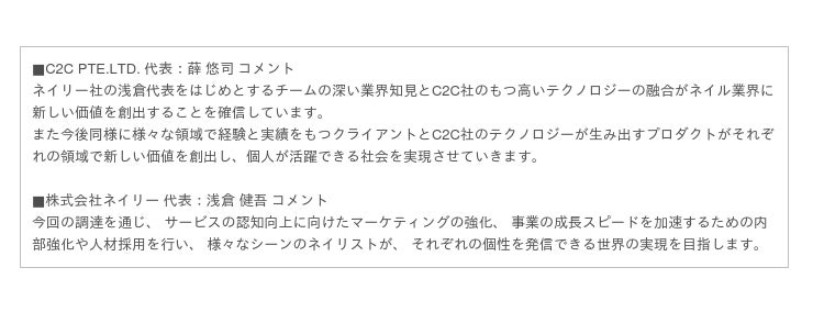 C2C PTE. LTD.(代表:薛 悠司、村上 英夫/https://c2c-platform.com)と共にCtoCサービス「ネイリー」を共同で開発している株式会社ネイリー(代表:浅倉 健吾/https://nailie.jp)は、株式会社サイバーエージェント等の新規株主を引受先とする第三者割当増資による資金調達を実施しました。