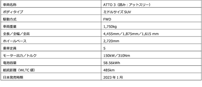 BYD Auto Japanは、2023年1月に販売を開始するミドルサイズe-SUV「ATTO 3(読み:アットスリー)」を皮切りに、順次、日本国内でEV3車種の販売を決定しています。