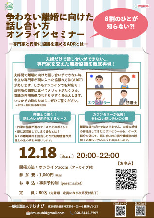 離婚後も両親で子育てに関わる"共同養育"サポートを行う一般社団法人りむすび(所在地:東京都渋谷区)は、「争わない離婚に向けた話し合い方に関するオンラインセミナー」を12/18に開催します。