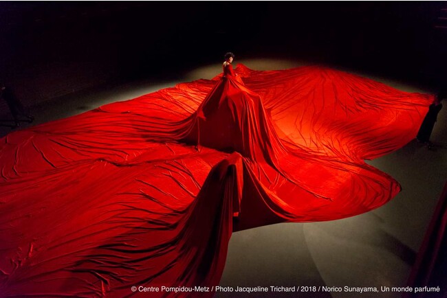 パブリックスペースに広がる巨大なスカート。来場者は砂山典子が着用する深紅のスカートの中に潜り込み鑑賞することができます。1995年に発表された本作は、スカートの中に広がる親密なプライヴェートスペースを覗き見るという行為を通じ、今なお、女性性の規範や何が暴力を引き起こすのかについて問いかけています。(令和5年度文化力チャレンジ補助事業)