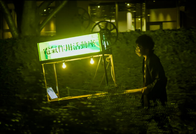京都の町を “黒い何か” が蠢くとき、いつもの日常が非日常へと塗り替えられます。“黒い何か”を映し出すのは、映写機や砲台から着想を得た映写車「電氣作 用活動座」。それは京都の街を縦横無尽に移動し、あらゆる場を劇場へと変貌させるのです。