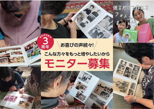 おかげさまで、写真整理サービス『おくってフォトブック』は3周年!!「重くてかさばるアルバムがすっきり整理できて、これで安心!!」 これまでの感謝の想い込めて、“無料モニター”希望者を募集します!!