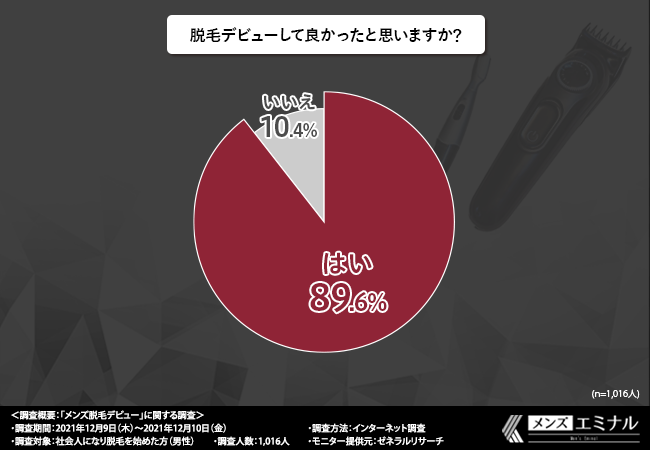 そこで、「脱毛デビューして良かったと思いますか?」と質問したところ、約9割の方が『はい(89.6%)』と回答しました。