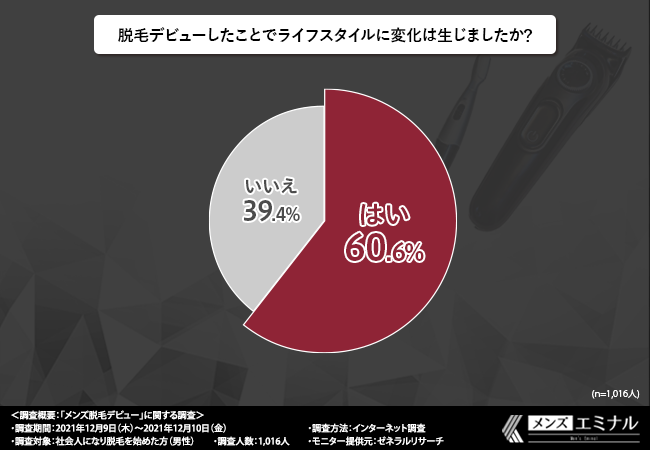 「脱毛デビューしたことでライフスタイルに変化は生じましたか?」と質問したところ、6割の方が『はい(60.6%)』と回答しました。