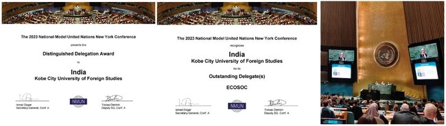 神戸市外国語大学(以下、本学)は、4月2日〜6日に米国で開催された、世界最大規模の模擬国連大会「模擬国連世界大会(National Model United Nations)ニューヨーク大会」に学生10名と教員3名を派遣し、Distinguished Delegation Award、Outstanding Delegates Award、特別功労賞の合計3つの賞を獲得し、優秀な成果を収めました。