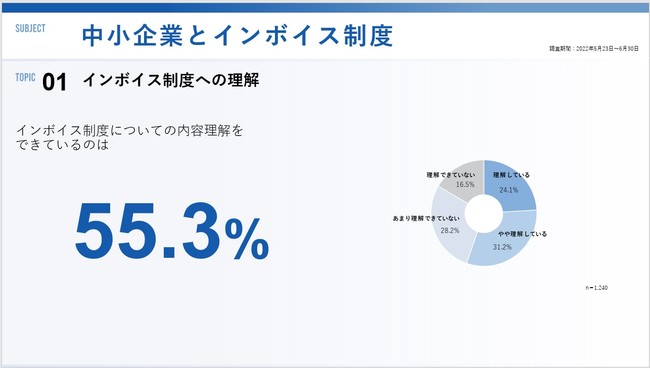 インボイス制度の理解度を把握する目的で行った調査の結果は、「理解している」(299社・24.1%)と「やや理解している」(387社・31.2%)の合計が55.3%となり、半数以上の企業で制度の理解が進んでいることがわかりました。一方、「あまり理解できていない」(350社・28.2%)と「理解できていない」(204社・16.5%)の合計は44.7%となり、具体的な内容理解まで進めていない企業が4割強にのぼっていることが分かります。