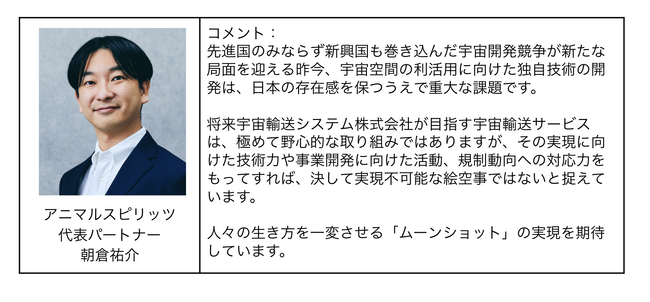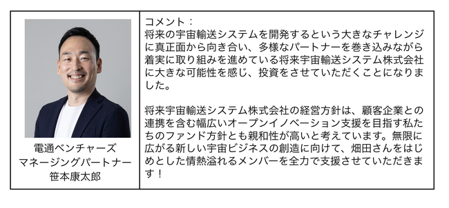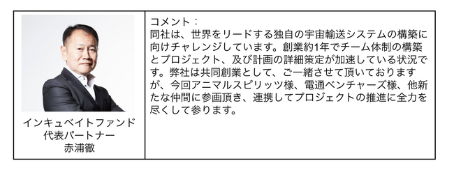今回、当社の宇宙輸送ビジネスの付加価値を最大化する観点から事業連携の可能性を高く評価して頂き、投資を決定して頂きました。