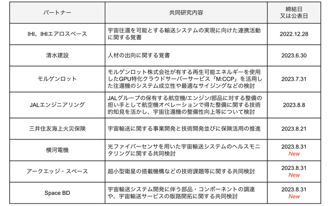 事業パートナーとの連携に関しては、様々な企業と連携に関する議論を重ねてきた結果、これまでに以下の企業・大学と協定等を締結して連携体制を構築してきました。
