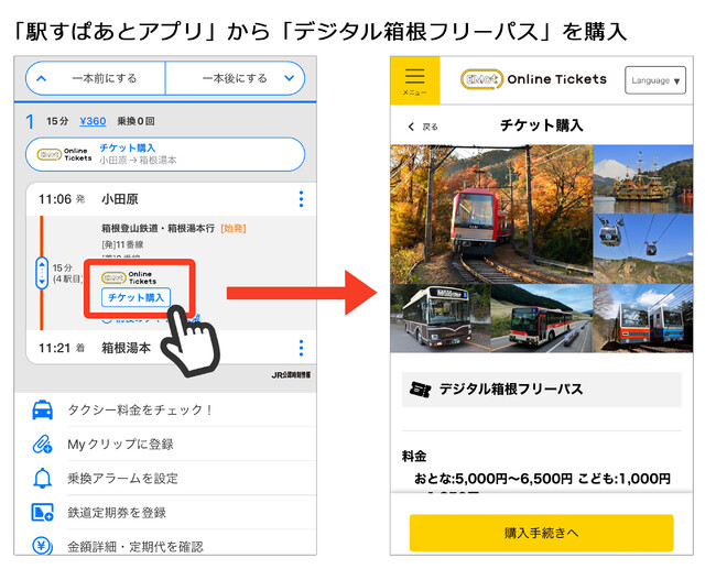 「駅すぱあとアプリ」での経路検索結果で、小田急ロマンスカーをはじめとした「EMotオンラインチケット」で販売している列車・バスの電子チケット対応区間を含む際、「EMotオンラインチケット」への遷移ボタンが表示されます。遷移した先では検索したルートを保持したまま電子チケットの予約・購入画面へ移るので、電子チケット購入のために別サイトを立ち上げて列車を再検索をする手間が省け、購入ミスも防ぐことができます。また、箱根をはじめとした江の島・鎌倉・大山など人気観光地のお得な周遊フリーパスにも対応しており、事前に1つずつ情報収集をする必要がなく、経路検索結果から旅の選択肢が広がります。