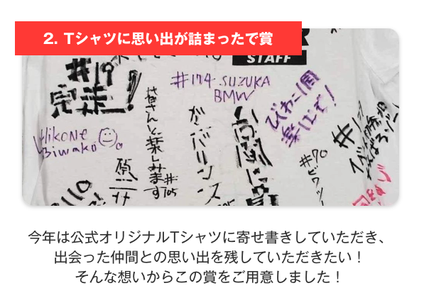 今年もTシャツをはじめ、様々なグッズの販売を予定しておりますが、CBTRでは公式グッズの売り上げの一部は、琵琶湖の水質改善に役立てていただくため、「琵琶湖応援寄付」に寄付させていただいております。地元あってのラリー、美しい自然あってのラリーというのが私たちの想いです。