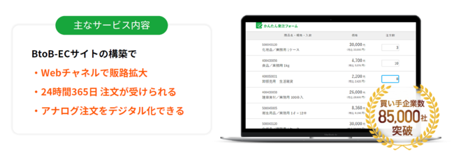 法人向けのBtoB-ECカートシステムです。FAXや電話での注文をWEBに切り替えて企業間取引の無駄を無くし、さらにECによる売上向上を実現します。
