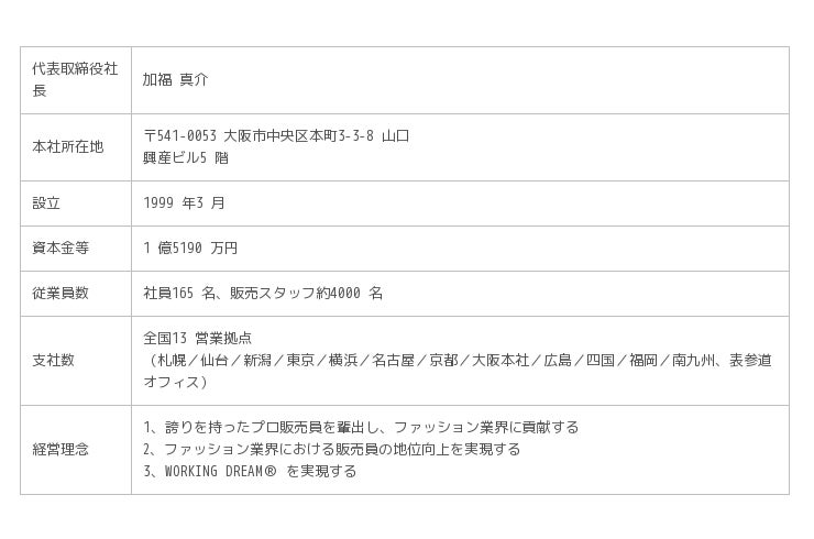 1999 年3 月に設立した、アパレル・ファッション・コスメ業界の販売職に特化したプロフェッショナルカンパニー。業界スペシャリティとして唯一47 都道府県を網羅し、キメ細やかなサービスを提供、独自の地位を築いてきました。ファッション・コスメ業界の数多くの著名ブランドの人材パートナーとして、 1500 社以上の取引先企業からの支持を得ており、人材紹介・人材派遣・教育・店舗運営・出店コンサルティング等を行っています。