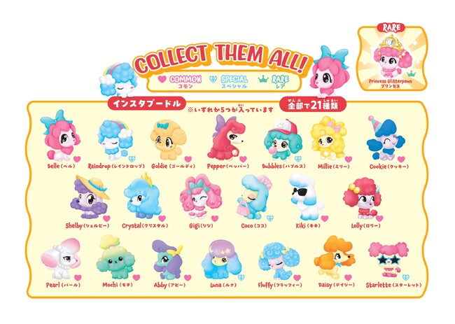 商品の中には、レアを含む全21種のプードルのうち、いずれか5つが入っており、どのプードルに出会えるかはお楽しみ!プードルのほかに付属しているプードルトイやプレイハウスと組み合わせながら自由に楽しむことができるため、幅広い遊び方ができることも魅力の1つです。カラフルでかわいいパーツを集める楽しさも!