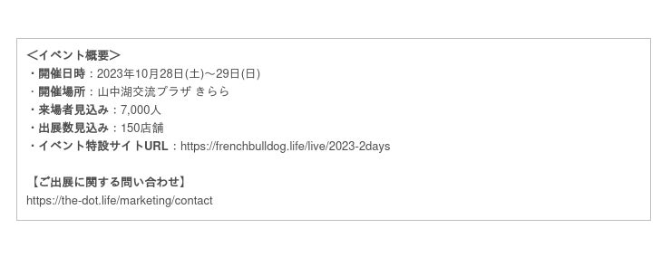 [国内最大級] 犬種特化型ドッグイベント『French Bulldog LIVE 2023』が10/28(土)〜29(日)に開催決定!7,000人の来場者と150店舗を誘致予定