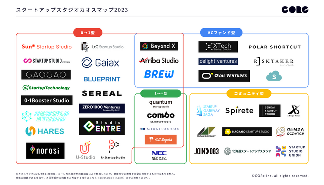 新規事業支援に強いデジタルクリエイティブカンパニーのコーレ株式会社(本社:東京都新宿区、代表取締役:奥脇真人、以下「コーレ」)は、日本国内のスタートアップスタジオ40組織をまとめたカオスマップ「スタートアップスタジオカオスマップ2023」を本日公開いたしました。このマップは、国内のスタートアップスタジオによるエコシステムの全体像を描き出し、起業家や投資家にとって重要な情報源となることを目指しています。