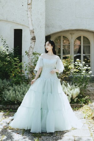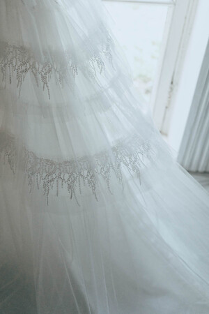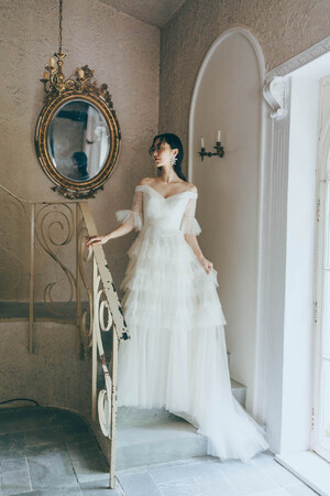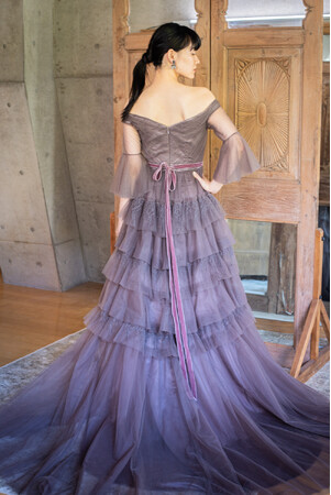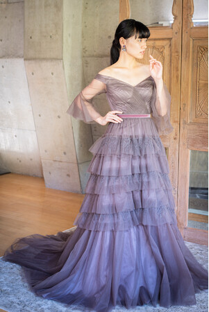 トップスからデコルテにかけて朝露をモチーフにしたようなレースがあしらわれ、所作の度に顔まわりまでも朝露のように煌めく。ギャザリングしたティアードスカートの透明感の美しいドレス。スリーブを取り外せば、すっきりと縦ラインが綺麗なシルエットに。