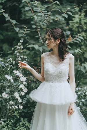 幾重にもレイヤードされたチュールと白い実がなるスノウベリーのようなレースが特徴。スノウベリーの花言葉は「いつまでも献身的に」。光を纏った時にレースが浮かび上がる姿が美しく、透明感溢れる1着。オフショルダーデザインが、上半身をすっきりとエレガントに魅せてくれる。色違いでセピアカラーのJuneberry(ジュンベリー)も。