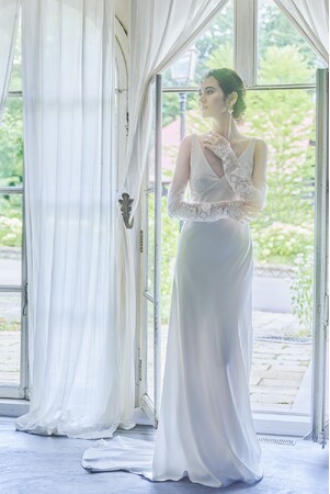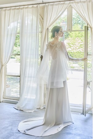 削ぎ落とされた究極にシンプルなドレスに、カットレースが美しいマントを肩につけることで羽根のような印象に。立ち去り姿が、美しい鶴(クレイン)が羽ばたく姿のような一着。同じカットレースで作られたスリーブ、ヘッドドレスで華やかさをプラスできる。
