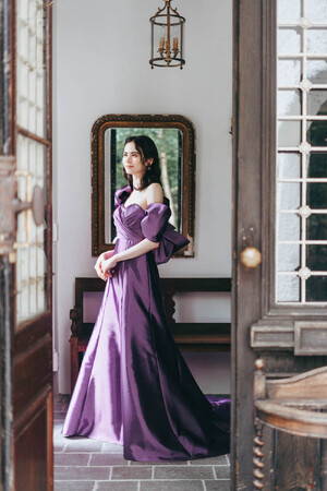 お着物の袂(たもと)や帯をインスピレーションに生まれたドレス。素材はスペインのアトリエで作られた、枯山水を思わせるような模様のジャカード生地を使用。トップスとスカートがセパレートになっており、組み合わせ方でコーディネートを楽しんでいただけます。スリットの入ったサテンスカートと、ジョーゼットのソフトマーメイドスカートからセレクトして、テクスチャーの異なるコントラストを楽しんでいただけます。
