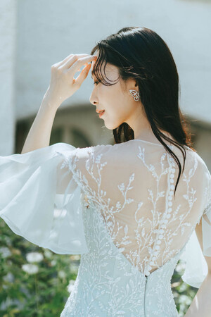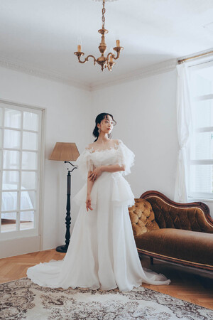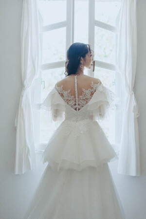 ドロップした肩から幾重にも重ねられた羽のように広がるベルスリーブと、ウエストのサイドからバックにかけて広がる取り外し可能なペプラムバッスルが華やかな1着。所作によって表情を変えるスリーブやイリュージョンネックに施されたレースは、ガーデンから摘んできた花を束ねたようなクラッチブーケをモチーフにしており、お顔周りも華やかに見せてくれる。