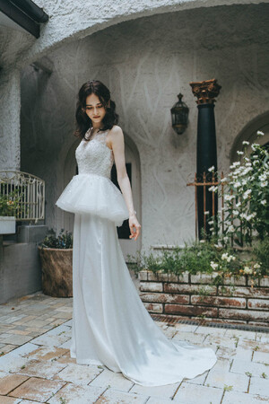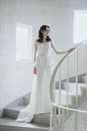 ロイヤルウェディングに欠かせないギンバイカ(マートル)の花の形状のように広がったペプラムが特徴。マートルの花言葉は「愛」「愛のささやき」「祝福」「高貴な美しさ」。スカートだけがボリュームのあるドレスとは違い、ペプラム部分だけが広がることでウエストを細く見せ、スカートが広がりすぎない分スタイリッシュでゲストとの距離が近くなるドレス。刺繍は朝露のように煌めくビーディングが特徴。